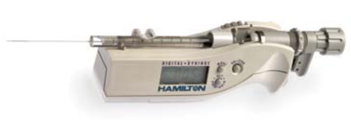 Данный аксессуар применяется для повешения воспроизводимости: шприц закрепляется в держателе, устанавливается в нулевое положение (полностью опушенный поршень), затем стопорный винт отодвигается на нужный объем. Цифровая шкала отображает текущее значение объема. Цифровой шприц можно применять для повышения точности рутинных работ вместо автодозатора. Так же возможно проведение калибровок с помощью данного инструмента. Благодаря цифровому шприцу можно отмерять объемы от 500мкл до 50нл с погрешностью не более 0.5%.
